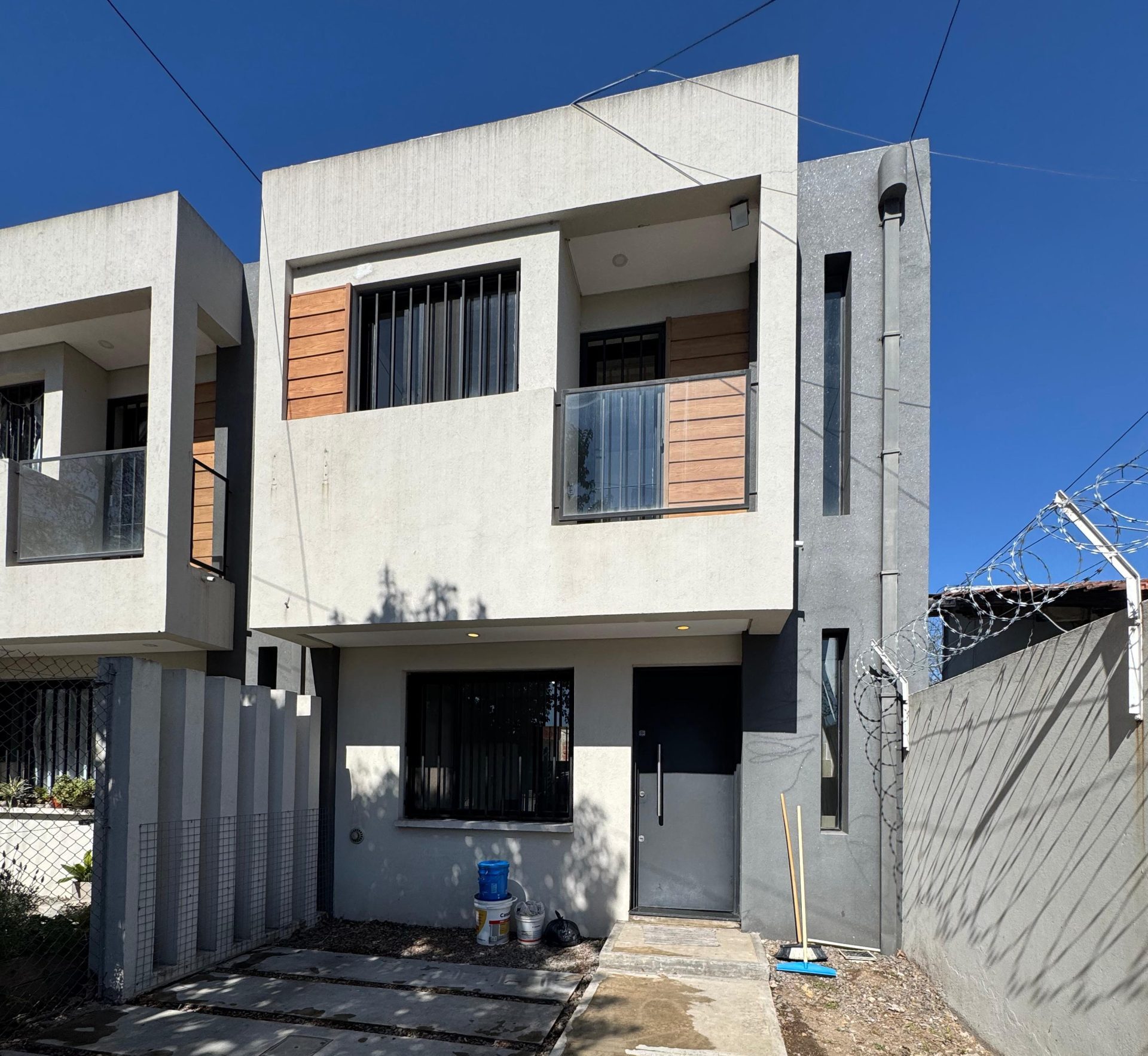 Pisos de porcelanato en planta baja y cerámico en Planta alta, carpinterías exteriores de aluminio negro, c/vidrios de seguridad; puertas placa interiores enchapadas en cedro con marco de chapa, puerta principal de madera maciza c/ marco de madera, barandas de los balcones en hierro negro y vidrio, revestimiento exterior texturado impermeable, frente cerrado con portones en hierro, individuales para ingreso vehicular.